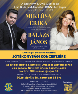 Szeretnénk felhívni a figyelmeteket a Széchenyi Lions Club és az Első Budapest-Gödöllő Lions Club közös jószolgálati eseményére, Miklósa Erika Kossuth-díjas operaénekes és Balázs János Kossuth-díjas zongoraművész Jótékonysági koncertjére.